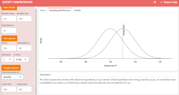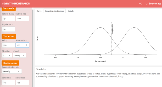 To use the Richard Morey Severity app to get the entries in Table 3.3 (SIST p. 145) you have to click on sampling distributions and make the replacements shown below (as it was created for an example we used with different numbers). His way of wording Severity, however, is enlightening. These entries are all for sample mean M = 151, and thus lead to “non-reject” (for the given 0.025 significance level cut-off). Hence, he computes SEV for mu ≤ various values. In each case, SEV is the area to the right of M = 151, computed under the alternative (153, 152, 151, 150.5, 150).
